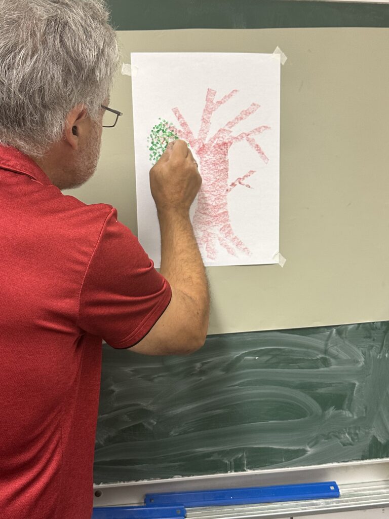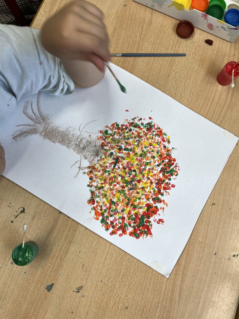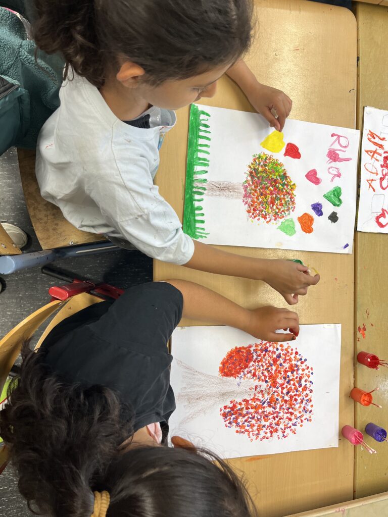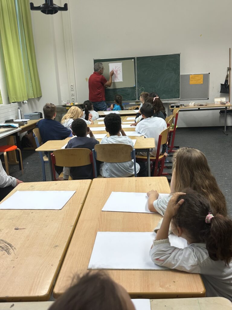 Im Rahmen von MUS-E® zeigte der Künstler Herr Mohr, der wöchentlich mit Kindern der WGS arbeitet, hier den Flamingos wie man mit Wachskreide, Wattestäbchen und Wasserfarben tolle Herbstbäume gestalten kann. Fleißig wurden Blätter in bunten Farben getupft.